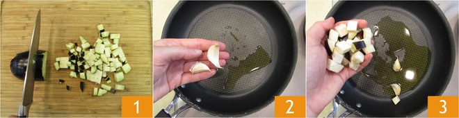 Um die Ofenpasta mit Auberginen zuzubereiten, schneiden Sie die Auberginen in Würfel von etwa 1 cm 1. Geben Sie etwas Öl und 2 Knoblauchzehen in eine Pfanne 2. Lassen Sie es für wenige Augenblicke erhitzen, dann fügen Sie die Auberginen hinzu 3.