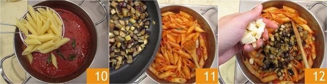 Die Pasta al dente abgießen und direkt in den Topf mit der Tomatensauce geben 10 und umrühren. Die Auberginen hinzufügen, einige für die Gratination beiseite lassen 11, und auch den Mozzarella hinzufügen, etwa 50 g beiseite lassen 12. Alles gut vermischen.