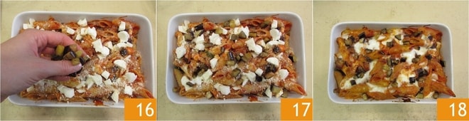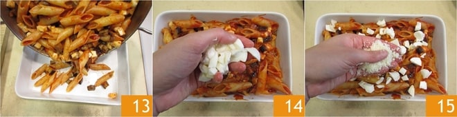 Die Pasta in eine Auflaufform geben 13, mit dem restlichen Mozzarella 14 und dem geriebenen Grana Padano DOP bedecken 15.