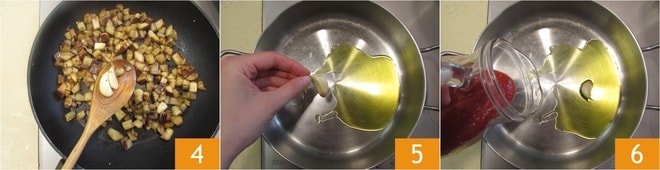 Braten Sie sie bei starker Hitze für 8-10 Minuten, bis sie weich und gut gebräunt sind. Entfernen Sie dann den Knoblauch 4 und stellen Sie sie beiseite. Nun kümmern Sie sich um die Sauce: Geben Sie etwas Öl in einen Topf, fügen Sie eine Knoblauchzehe hinzu 5 und lassen Sie sie bei mittlerer Hitze goldgelb werden. Nun die Tomatenpassata hinzufügen 6 und mit Salz abschmecken.