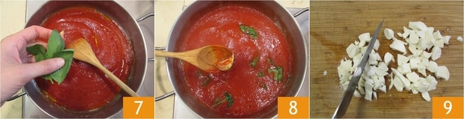 Fügen Sie die Basilikumblätter hinzu 7 und lassen Sie die Sauce bei niedriger Hitze etwa 15 Minuten köcheln, dann entfernen Sie den Knoblauch 8. In der Zwischenzeit die Pasta in kochendem Salzwasser kochen, entsprechend der auf der Verpackung angegebenen Zeit. Schneiden Sie die Mozzarella in Würfel von etwa 1 cm 9.