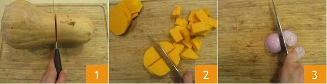Um die Ofenpasta mit Kürbis und Stracchino-Béchamel zuzubereiten, beginnen Sie mit der Reinigung des Kürbisses. Schälen Sie ihn 1, entfernen Sie die Fasern mit den Samen und schneiden Sie ihn dann in grobe Stücke. Sie erhalten 500 g gereinigten Kürbis 2. Dann schälen Sie die Schalotte und schneiden Sie sie in Ringe 3.