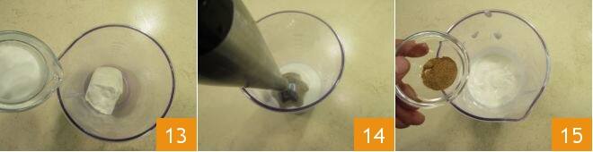 Jetzt zur Stracchino-Béchamel. In eine Schüssel geben Sie den Stracchino zusammen mit der Milch 13, bedienen den Stabmixer 14 und erhalten eine homogene Creme. Dann würzen Sie mit Salz und geriebener Muskatnuss und mischen 15.