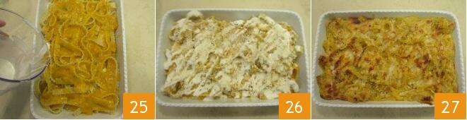 die Béchamel 25 und bestäuben Sie mit Pfeffer und dem restlichen Grana Padano 26. An dieser Stelle kann Ihre Ofenpasta mit Kürbis und Stracchino-Béchamel bei 200° etwa 35 Minuten im Ofen backen. Einmal herausgenommen, müssen Sie sie nur noch servieren 27!