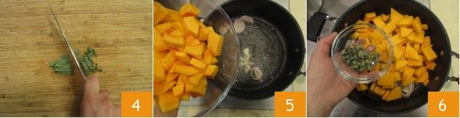 Zum Schluss schneiden Sie auch den Salbei in Streifen 4. Nun, da alles bereit ist, gehen wir zur Zubereitung. In einem Topf erhitzen Sie etwas Öl zusammen mit der Schalotte. Nach wenigen Augenblicken fügen Sie auch den Kürbis 5 und den Salbei 6 hinzu.