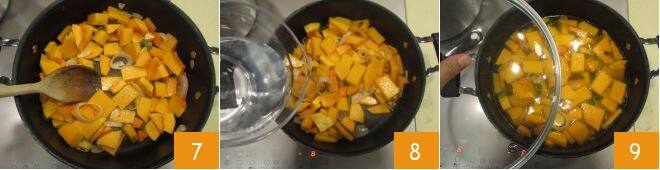Erhöhen Sie die Hitze und rühren Sie häufig um, damit alles gut durchzieht 7. Fügen Sie das Wasser hinzu 8 und decken Sie es mit einem Deckel ab, lassen Sie alles etwa zehn Minuten bei mittlerer Hitze köcheln 9.