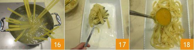 An dieser Stelle können Sie die Pasta in kochendem, gesalzenem Wasser kochen, dabei darauf achten, dass Sie sie halbgar abgießen 16. Geben Sie sie in ein Gefäß und dann nach und nach in eine Auflaufform von 36,5x24 cm, in der Sie bereits etwas Stracchino-Béchamel verteilt haben 17. Verteilen Sie die Oberfläche mit etwas Kürbiscreme 18,