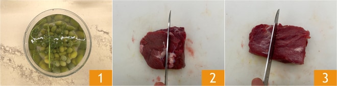 Um die Oliven nach Ascoli-Art zuzubereiten, lassen Sie zuerst die Oliven 12 Stunden in wasser mit frischem Fenchel ziehen 1. Bereiten Sie das Fleisch für die Füllung vor: schneiden Sie das Rindfleisch 2 und das Schweinefleisch 3 in kleine Stücke.