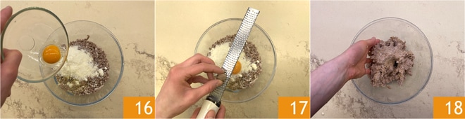 Geben Sie das gehackte Fleisch in eine Schüssel und fügen Sie den geriebenen Parmigiano Reggiano DOP und das Ei hinzu 16, würzen Sie mit geriebener Muskatnuss 17 und kneten Sie mit den Händen, um eine homogene Mischung zu erhalten 18.