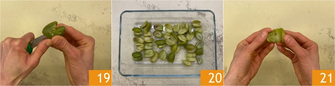 Jetzt die Oliven spiralförmig aufschneiden, um den Kern zu entfernen 19 20. Zur Füllung übergehen: die Oliven auseinanderziehen 21.