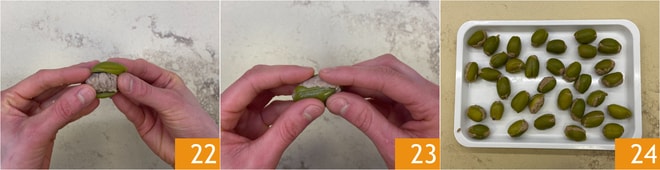 Die Oliven mit der Mischung füllen 22 und schließen 23, um die ursprüngliche Form wiederherzustellen 24.