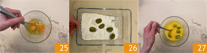 Nun zur Panade: die Eier mit dem Salz verquirlen 25, dann die gefüllten Oliven zuerst in Mehl 26, dann in Eier 27 tauchen.