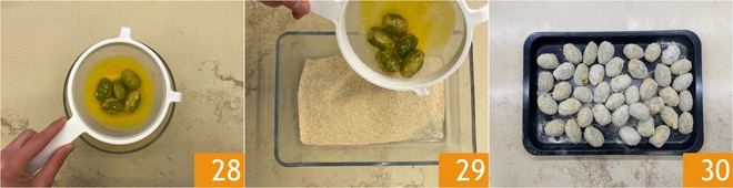 Abtropfen lassen, um überschüssiges Ei zu entfernen 28 und schließlich die Oliven in Paniermehl wenden 29. Auf einem Tablett ablegen 30.