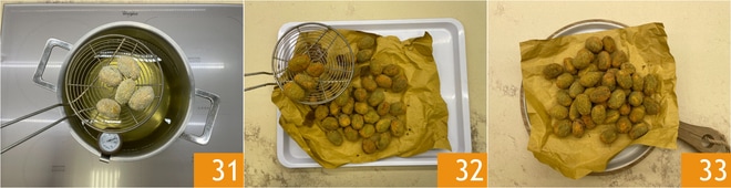 Zum Schluss zum Frittieren übergehen: das Pflanzenöl erhitzen und wenn es eine Temperatur von 180° erreicht hat, die Oliven eintauchen 31. Etwa 2 Minuten kochen, bis sie goldbraun sind, dann auf einem mit Küchenpapier ausgelegten Tablett abtropfen lassen 32 und die Oliven nach Ascoli-Art leicht warm servieren 33!