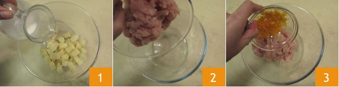 Um die Hähnchenbällchen mit Orange zuzubereiten, geben Sie zunächst das gewürfelte Brot in eine Schüssel mit der warmen Milch 1 und lassen es einweichen. In einer anderen Schüssel geben Sie das gehackte Hähnchenfleisch 2 und die Orangenschale 3.