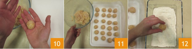 Nehmen Sie eine kleine Portion Teig und formen Sie mit den Händen ein Bällchen von der Größe einer Walnuss 10. Legen Sie die Bällchen auf ein mit Backpapier ausgelegtes Tablett 11. Rollen Sie jedes Bällchen in Mehl 12.