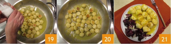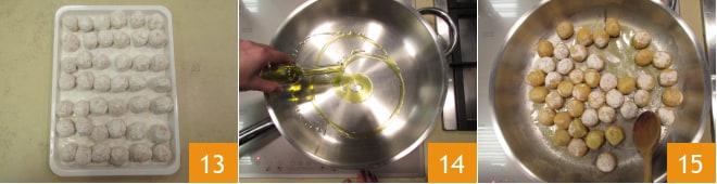 Nachdem Sie dies beendet haben 13, erhitzen Sie das Öl in der Pfanne 14, legen Sie die Bällchen hinein 15 und braten Sie sie 5 Minuten lang.