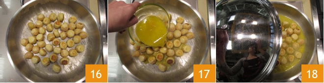 Wenden Sie sie von allen Seiten, und wenn sie gut gebräunt sind 16, löschen Sie mit Orangensaft ab 17, decken Sie mit einem Deckel ab 18 und köcheln Sie bei niedriger Hitze etwa 10 Minuten.