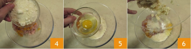 Würzen Sie mit dem geriebenen Käse 4, dann das Ei 5 und das eingeweichte Brot 6 einarbeiten.