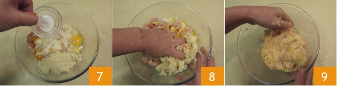 Salzen Sie 7 und vermischen Sie die Zutaten 8 mit den Händen, bis ein homogener Teig entsteht 9.