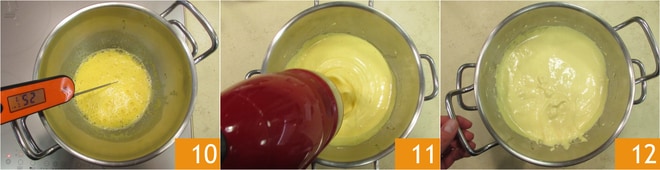 Sobald die richtige Temperatur erreicht ist 10, nehmen Sie die Schüssel aus dem Wasserbad und schlagen Sie die Mischung mit einem elektrischen Handrührgerät 11, bis sie schaumig ist 12.