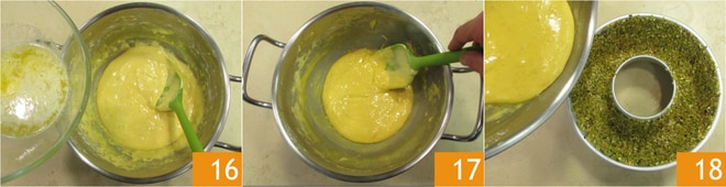 Um den Orangenkuchen zuzubereiten, fetten Sie zuerst die Gugelhupfform ein 1 und streuen Sie das Pistaziengranulat hinein 2, so dass es die Form vollständig bedeckt 3. Stellen Sie es beiseite und bereiten Sie den Teig vor.