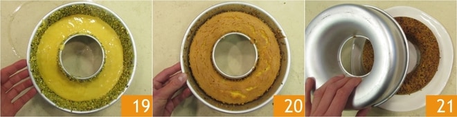 Backen Sie den Kuchen im vorgeheizten statischen Ofen bei 170°C für etwa 40 Minuten 19. Überprüfen Sie die Garheit mit einem Holzstäbchen, nehmen Sie den Kuchen dann aus dem Ofen und lassen Sie ihn in der Form abkühlen 20. Sobald er abgekühlt ist, stürzen Sie den Gugelhupf auf eine Servierplatte und lassen ihn vollständig auskühlen 21.