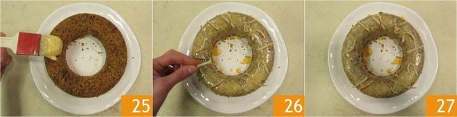 Bestreichen Sie die Oberfläche des Gugelhupfs mit der Glasur 25 und verzieren Sie ihn mit den kandierten Orangenschalen 26. Ihr Orangen-Gugelhupf ist bereit zum Servieren 27!