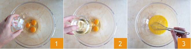 Um die Orangen-Schokoladen-Cupcakes zuzubereiten, schlagen Sie die Eier in eine Schüssel und geben Sie eine Prise Salz dazu 1, fügen Sie das Öl hinzu 2 und schlagen Sie alles mit einem Schneebesen 3.