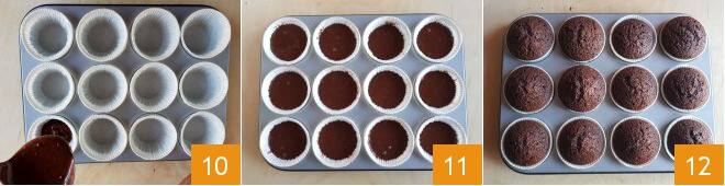 Legen Sie eine Muffinform mit Einweg-Muffinförmchen aus. Füllen Sie die Förmchen mit dem Teig 10, bis etwas über die Hälfte 11. Backen Sie sie bei 180° für 25 Minuten. Sobald sie fertig sind, nehmen Sie sie aus dem Ofen und lassen Sie sie abkühlen 12.