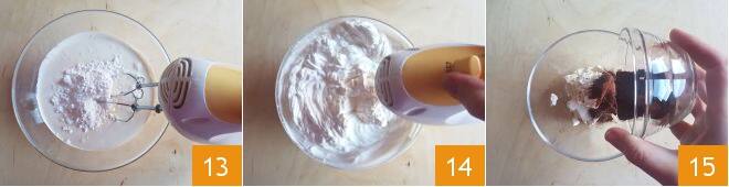 Widmen Sie sich dem Frosting: Gießen Sie die frische Sahne in eine Schüssel, fügen Sie 150 g Puderzucker von der Gesamtmenge hinzu 13 und schlagen Sie sie mit einem elektrischen Mixer 14. Geben Sie den Frischkäse in eine andere Schüssel, fügen Sie den Kakao hinzu 15,