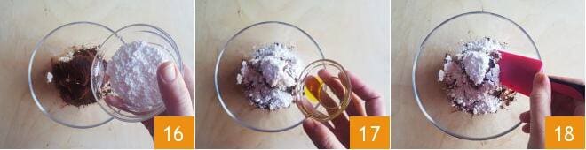 und den restlichen 50 g Puderzucker 16. Geben Sie auch das Orangenaroma hinzu 17 und rühren Sie mit einem Spatel, bis alles vermengt ist 18.