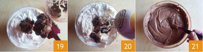 Fügen Sie die Frischkäsemischung zur geschlagenen Sahne hinzu 19 und vermengen Sie die beiden Mischungen auf niedrigster Geschwindigkeit mit dem elektrischen Mixer 20, bis sie glatt und homogen sind 21.