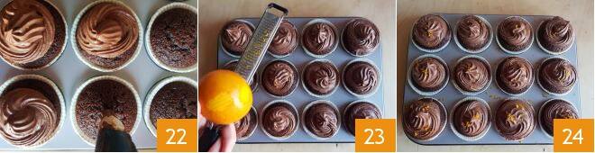 Füllen Sie einen Spritzbeutel mit Sterntülle mit dem Frosting und dekorieren Sie die mittlerweile abgekühlten Cupcakes 22. Vervollständigen Sie mit geriebener Orangenschale 23. Die Orangen-Schokoladen-Cupcakes sind bereit, genossen zu werden 24.