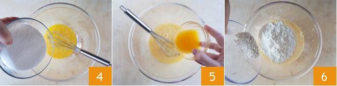 Geben Sie auch den Zucker hinzu 4 und mischen Sie erneut alles. Pressen Sie die Orangen aus und fügen Sie den Saft zur Eiermasse hinzu 5, rühren Sie erneut. Geben Sie dann das Mehl hinzu 6,