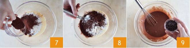 den Kakao 7 und das Backpulver 8, mischen Sie gut, bis alles vermengt ist. Zuletzt fügen Sie die Schokoladenstückchen hinzu 9.