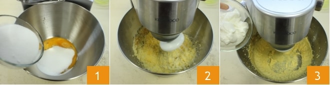 Um den Orangenkuchen mit Joghurtcreme zuzubereiten, beginnen Sie mit der Basis: Geben Sie die Eigelbe in die Schüssel einer Küchenmaschine mit Schneebesen, wobei Sie darauf achten, die Eiweiße beiseite zu stellen, die später benötigt werden. Fügen Sie den Eigelben die Hälfte des Zuckers hinzu 1, schalten Sie die Küchenmaschine ein und schlagen Sie die Mischung, um die Zutaten zu vermischen 2, fügen Sie bei laufender Maschine den Joghurt hinzu 3