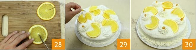 Schneiden Sie dünne Orangenscheiben und ritzen Sie sie mit einem Messer ein 28, falten Sie die Scheiben zu einer Art Spirale, die Sie zusammen mit den kandierten Orangenschalen auf den Kuchen legen 29. Ihr Orangenkuchen mit Joghurtcreme ist nun bereit, genossen zu werden 30!