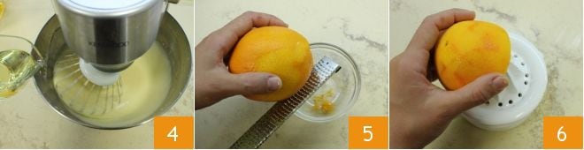 und das Pflanzenöl 4. Rühren Sie weiter, bis die Zutaten eingearbeitet sind und die Mischung glatt und homogen ist. Reiben Sie nun die Orangenschale ab 5, pressen Sie den Saft aus 6