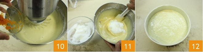 Integrieren Sie nun auch die abgeriebene Orangenschale 10. Nehmen Sie die beiseite gestellten Eiweiße und schlagen Sie sie steif mit einer Prise Salz und dem restlichen Zucker, entweder mit einer Küchenmaschine oder einem elektrischen Handmixer. Fügen Sie die geschlagenen Eiweiße zur Mischung hinzu, indem Sie vorsichtig mit einem Spatel von unten nach oben rühren 11, um sie nicht zu entlüften. Nehmen Sie dann eine 24 cm Springform, buttern Sie sie ein und kleiden Sie sie mit Backpapier aus (für die Anleitung können Sie hier nachsehen: wie man eine Springform mit Backpapier auslegt). Gießen Sie den Teig in die Form 12 und backen Sie den Kuchen im vorgeheizten statischen Ofen bei 180°C für 45 Minuten, bis er oben goldbraun ist (oder im Umluftofen bei 160°C für etwa 35 Minuten).