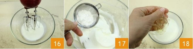 Schlagen Sie mit einer Küchenmaschine oder einem Handmixer 200 ml Sahne 16 mit der Hälfte des Puderzuckers; mischen Sie den restlichen Puderzucker separat mit dem Joghurt 17 und heben Sie dann die geschlagene Sahne unter. Zum Schluss schmelzen Sie die Gelatine in den übrigen 100 ml erhitzter Sahne 18