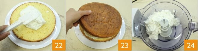und fügen Sie die erhaltene Mischung zur Joghurt-Sahne-Creme hinzu 19; gut mischen, die Creme mit Frischhaltefolie abdecken 20 und mindestens 1 Stunde im Kühlschrank ruhen lassen. Wenn der Kuchen fertig ist, aus dem Ofen nehmen und abkühlen lassen, einmal abgekühlt, halbieren Sie ihn mit einem gezackten Messer 21.