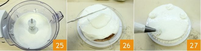 um sie weicher und glatter zu machen 25. Stellen Sie den Kuchen auf ein Gitter und lassen Sie die Creme darüber fließen 26, bis die Basis vollständig bedeckt ist. Geben Sie die restliche Creme in einen Spritzbeutel mit Sterntülle und dekorieren Sie die Oberfläche des Kuchens mit Tupfen 27.