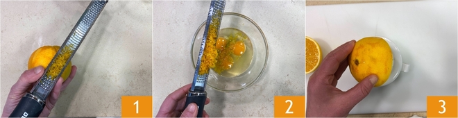 Um den Orangenkuchen zuzubereiten, beginnen Sie damit, die Schale von zwei Orangen mit einer Reibe abzunehmen, wobei Sie darauf achten, die weiße Schicht nicht zu entfernen 1. Geben Sie sie zusammen mit den Eiern in eine Schüssel 2. Dann pressen Sie die Orangen mit einer Saftpresse aus, um den Saft zu gewinnen 3.