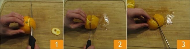 schneiden Sie aus jeder Hälfte 4 Stücke 4. Wiederholen Sie diesen Vorgang für alle Orangen, bis Sie 1 kg Orangenfruchtfleisch erhalten. Geben Sie es dann in einen Topf 5 und fügen Sie den Zucker hinzu 6.