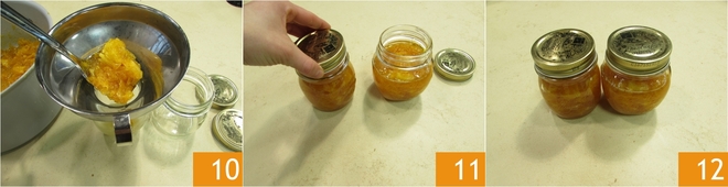 Verwenden Sie einen Trichter, um die heiße Konfitüre in die Gläser zu füllen 10, dann wischen Sie die Ränder gut ab, falls sie verschmutzt sind, und schließen Sie mit den eigenen Deckeln, indem Sie sie ziemlich fest anziehen 11. Drehen Sie die Gläser um und lassen Sie sie in dieser Position abkühlen, bevor Sie sie wieder aufrecht hinstellen 12. Sobald die Gläser abgekühlt sind, überprüfen Sie, ob das Vakuum korrekt gebildet wurde: Sie können in die Mitte des Deckels drücken und wenn Sie nicht das typische "Klick-Klack" hören, ist das Vakuum entstanden. Ihre Orangenmarmelade ist fertig, warten Sie ein paar Tage, bevor Sie sie genießen!