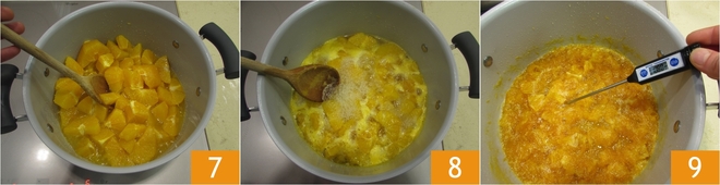 Bei mittlerer Hitze auf den Herd stellen und sobald sich der Zucker aufgelöst hat 7 und das Fruchtfleisch beginnt, sich aufzulösen, die Hitze reduzieren. Lassen Sie es köcheln und rühren Sie gelegentlich um 8. Messen Sie die Temperatur der Orangenmarmelade mit einem Lebensmittelthermometer und sobald sie 108° erreicht 9, schalten Sie den Herd aus; dies dauert etwa 60 Minuten.