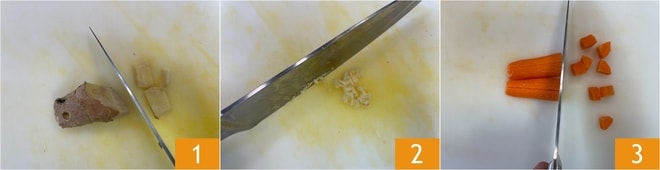 Um die gebratene Dorade auf Karottencreme zuzubereiten, beginnen Sie damit, den Ingwer zu schälen 1 und fein zu hacken 2. Schälen Sie die Karotten und schneiden Sie sie grob in Stücke 3.