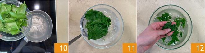 Stellen Sie die Creme beiseite und bereiten Sie das Basilikumöl zu: Blanchieren Sie die Blätter für ein paar Sekunden 11, dann tauchen Sie sie in Eiswasser 12. Drücken Sie die Blätter gut aus 12.