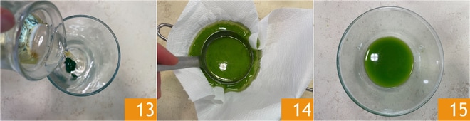 Geben Sie sie in einen Behälter 13, fügen Sie das Öl hinzu und pürieren Sie mit dem Stabmixer. Filtern Sie die Mischung durch ein Tuch 14 und bewahren Sie das gewonnene Basilikumöl auf 15.